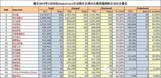 Alphaliner于2016年10月8日發(fā)布最新集裝箱班輪公司排名,全球班輪公司運(yùn)力100強(qiáng)中排名前三的分別是馬士基航運(yùn)、地中海航運(yùn)和達(dá)飛輪船,運(yùn)力共占據(jù)全球運(yùn)力的39.2%。而韓進(jìn)海運(yùn)由9月1日的第7名跌落至第16名,運(yùn)力份額降至1.7%。全球前20大集裝箱班輪公司運(yùn)力排名如上圖。